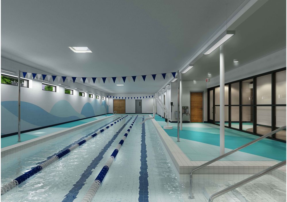 Design accounts for full mechanical equipment updates, including two roof top units -- one for the general space and a specialized moisture controlling unit for the pool area -- duct work, new electrical panels and circuits, low voltage, ADA compliance, new supply and waste piping, lighting, flooring, acoustical ceiling, painting, fire protection, new windows and doors, exterior rehabilitation including repavement of the parking lot and replacement of sidewalks, tuckpointing and roof replacement over the entire facility.